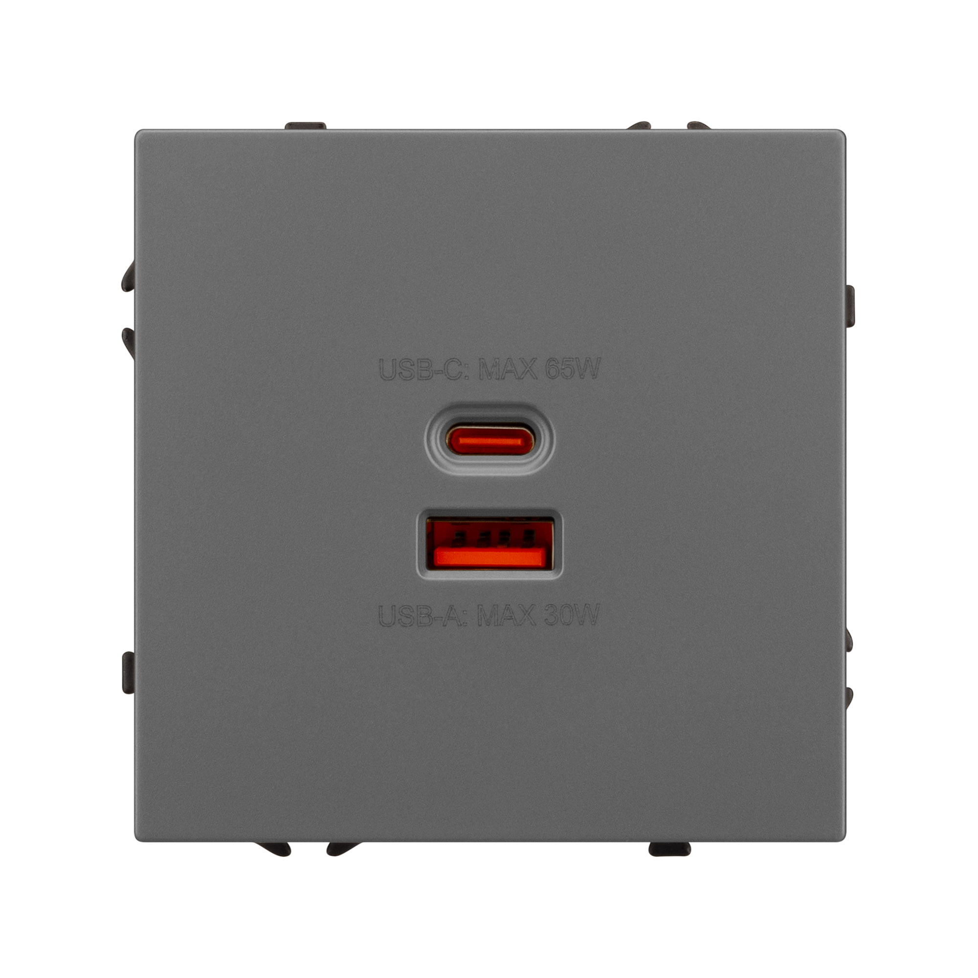 Строгие геометрические линии гармонично сочетаются с функциональностью продуманных механизмов, создавая идеальное решение для дизайн-проектов, где важны как эстетика, так и практичность. Механизм розетки с быстрой USB зарядкой, совместимый с рамками серии NOBE, создает утонченный минималистичный вид. Наличие USB Type A и Type C портов позволяет существенно сократить количество используемых розеточных постов под евровилку, сохраняя единую стилистику интерьера всего современного дизайн-проекта. Оба разъема поддерживают протокол быстрой зарядки Quick Charge QC 3.0, помимо этого для разъема Type C доступен протокол Power Delivery*. Выходные параметры для данных типов портов при этом составляют 30W и 65W соответственно. Видимая часть механизма выполнена из высококачественного пластика серого цвета и имеет Soft-Touch покрытие, что придает изделию приятные тактильные ощущения и стильный внешний вид. Контактная часть присоединяется при помощи винтовых зажимов, позволяя надежно подсоединить механизм выключателя к питающим элементам. Суппорт окрашен в черный матовый цвет под основу механизма и выполнен из металла толщиной 1,5мм, что обеспечивает безопасность и уверенность в установке. На каждой стороне суппорта размещены фиксирующие элементы, позволяющие комбинировать механизмы в системы до 5шт как горизонтально, так и вертикально. *Для активации функции быстрой зарядки необходимо использовать специализированный зарядный кабель, который предназначен для работы с зарядными устройствами повышенной мощности.